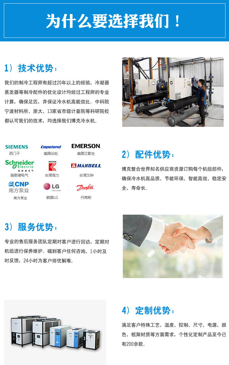 3)具體選用多大的冷水機請咨詢在線客服或聯(lián)系博克公司銷售熱線13515886884獲取您所需工況的選型報告。博克還可根據(jù)客戶要求定制非標(biāo)產(chǎn)品