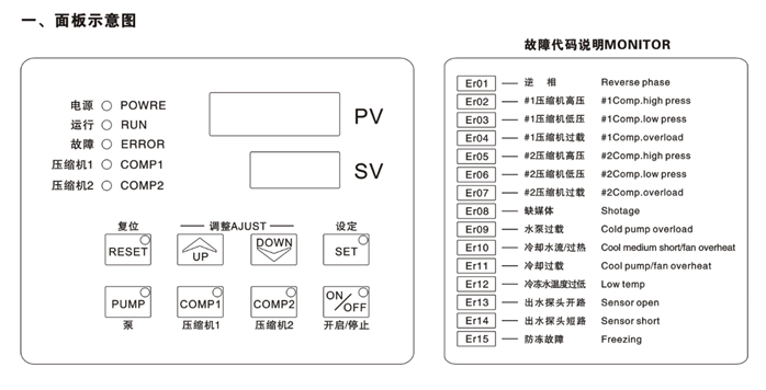 具體操作流程、參數(shù)設(shè)置、故障代碼說明、電器連接示意圖詳見下載中心《冷水機微電腦控制板》