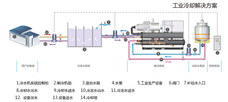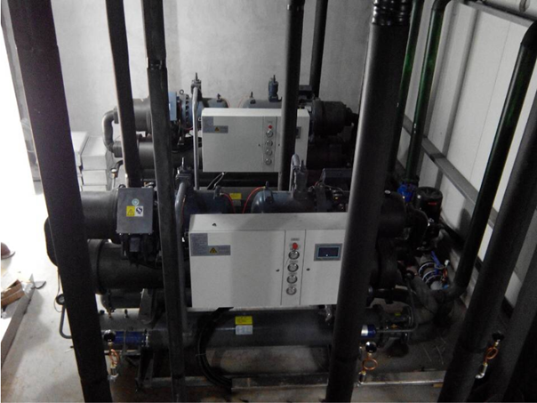 1)水冷螺桿式低溫冷水機組是以半封閉雙螺桿壓縮機為核心,以制冷劑為載體,制冷時以水為冷源,將負(fù)載側(cè)的熱量通過制冷循環(huán)釋放到冷源,從而對負(fù)載側(cè)進行降溫。