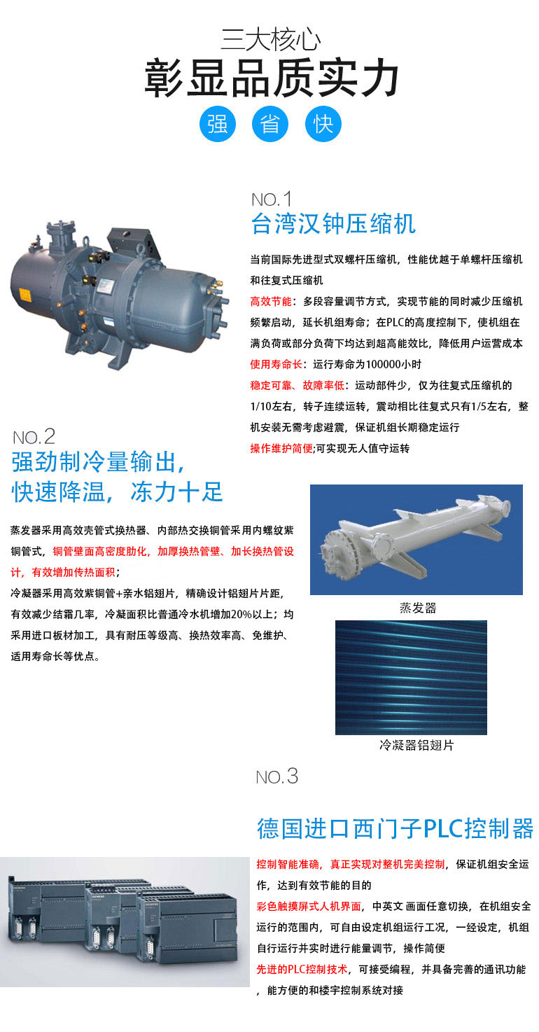 國際知名品牌臺灣漢鐘雙螺桿壓縮機,能效比高,壽命長(運行壽命100000小時),故障率低,維護簡便。